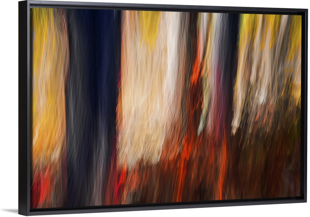 <p>Abstract image of a bunch of huckleberry bushes in glorious Autumn red, in between a bunch of tree trunks blackened and stripped in a wildfire. The image was made in the mountains close to Rossland, British Columbia, Canada in early October, 2022. It was made using the ICM (Intentional Camera Movement) technique. This technique creates the colorful stripes in the image, and serves to give a good impression of the place. Ursula Abresch Abstract Trees Collection</p>