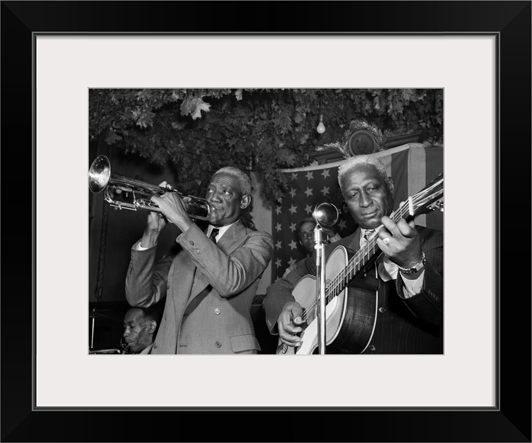 <p>(1889-1949). Known as 'Lead Belly'. American folk musician. Performing with Bunk Johnson at the Stuyvesant Casino in New York City.Photograph by William P. Gottlieb, c1946.</p>