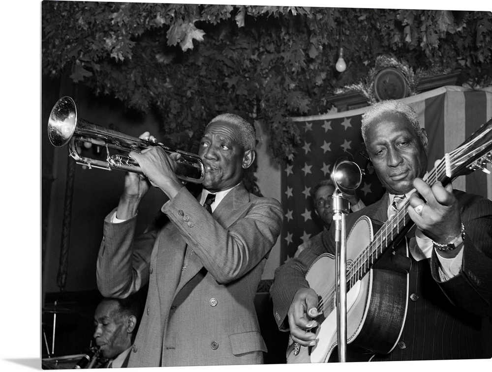 <p>(1889-1949). Known as 'Lead Belly'. American folk musician. Performing with Bunk Johnson at the Stuyvesant Casino in New York City.Photograph by William P. Gottlieb, c1946.</p>