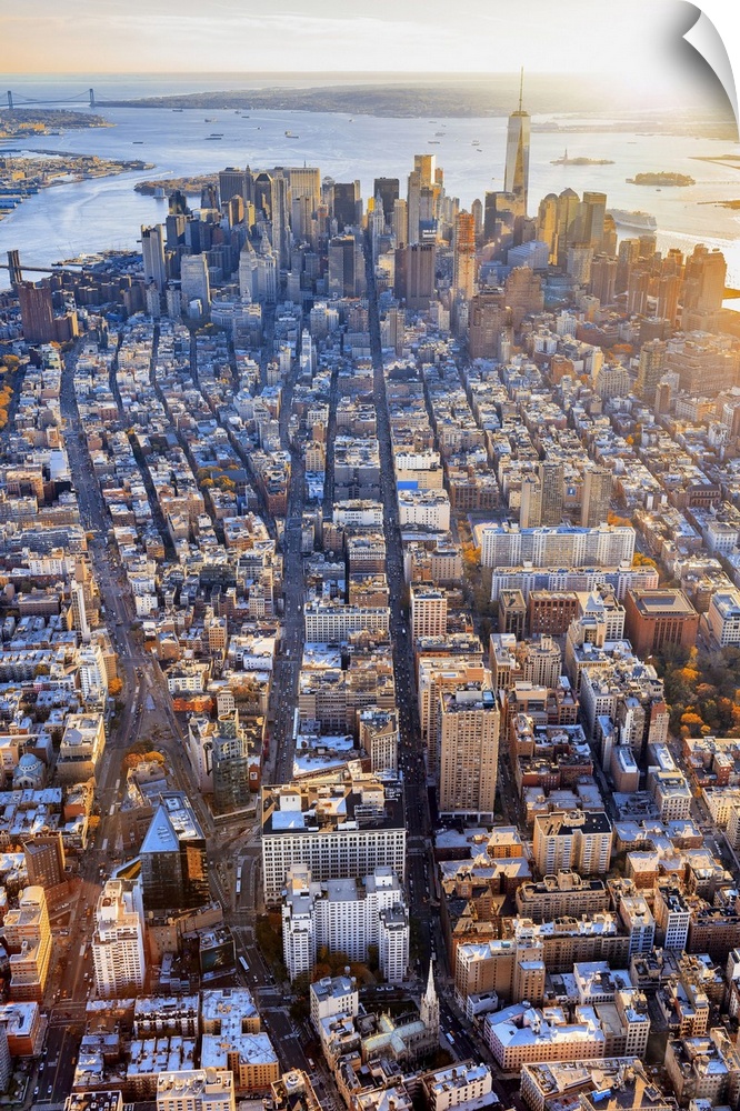 <p>USA, New York City, Hudson, Manhattan, Lower Manhattan, One World Trade Center, Freedom Tower, Aerial view towards One World Trade Center ad Brooklyn Bridge at sunset</p>