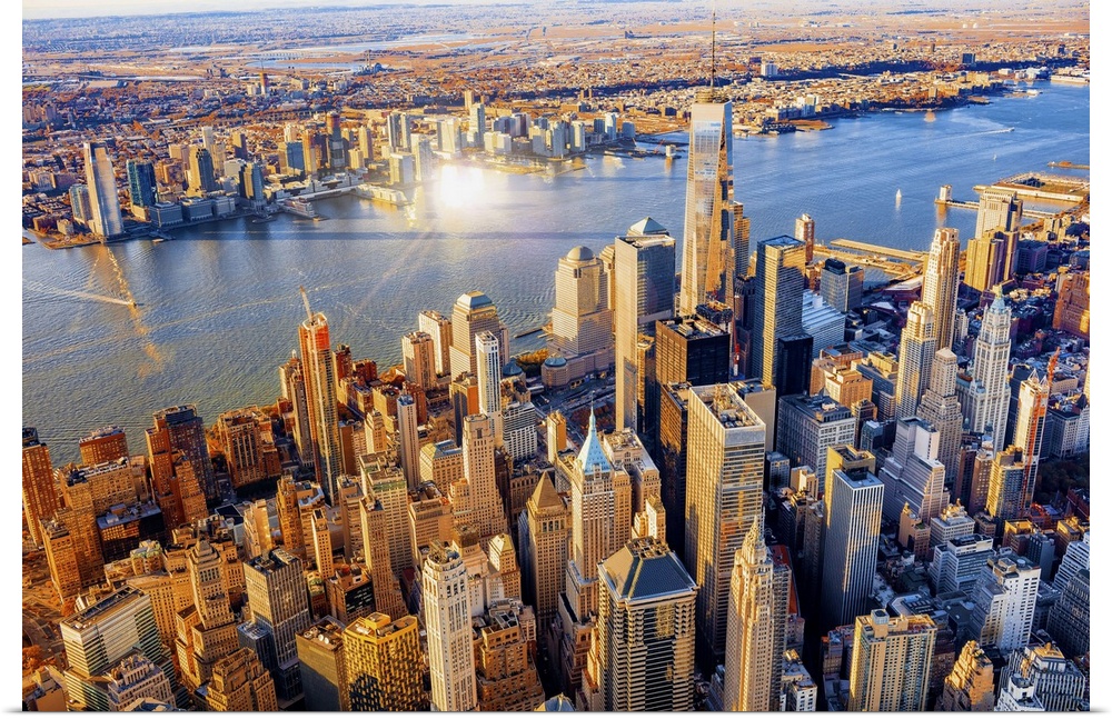 <p>USA, New York City, Hudson, Manhattan, Lower Manhattan, One World Trade Center, Freedom Tower, Aerial view towards One World Trade Center at sunset</p>