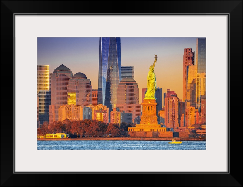 <p>USA, New York City, Hudson, Manhattan, Lower Manhattan, Liberty Island, Statue of Liberty, One World Trade Center with Freedom Tower across the Hudson River at sunset</p>