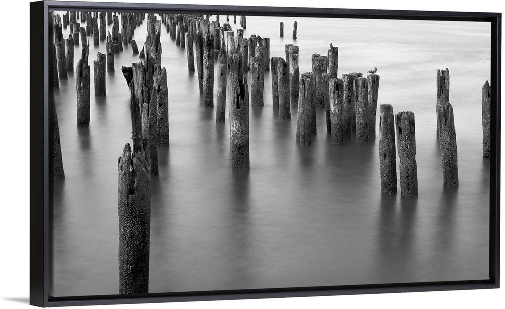 <p>Black and white photograph of weathered wooden posts in the ocean.</p>