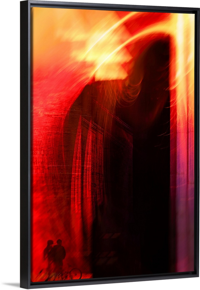 <p>Abstract vertical photograph of swirls of bright red and yellow light with a couple with a bicycle looking on.</p>