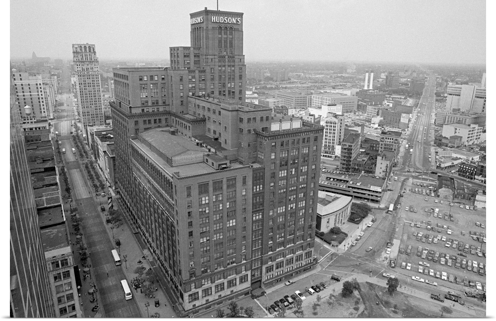 <p>Overview of the downtown Hudson's department store on Woodward Avenue (left) in Detroit, several months before its planned closure in January of 1983. July 14, 1982.</p>