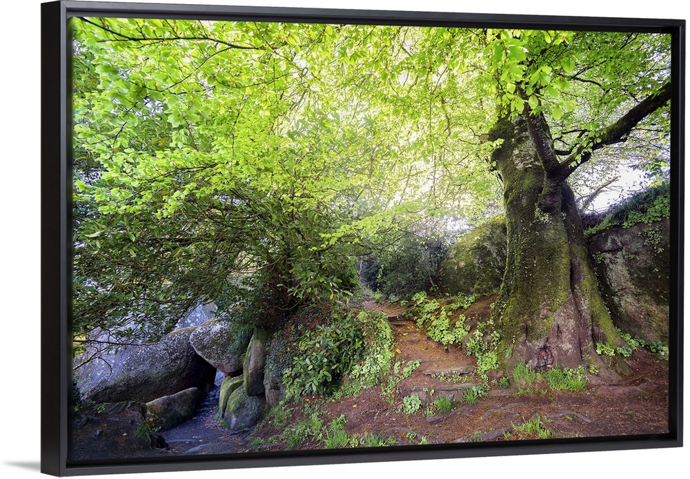 <p>Tall trees with light shining through the branches in the Huelgoat forest in France.</p>