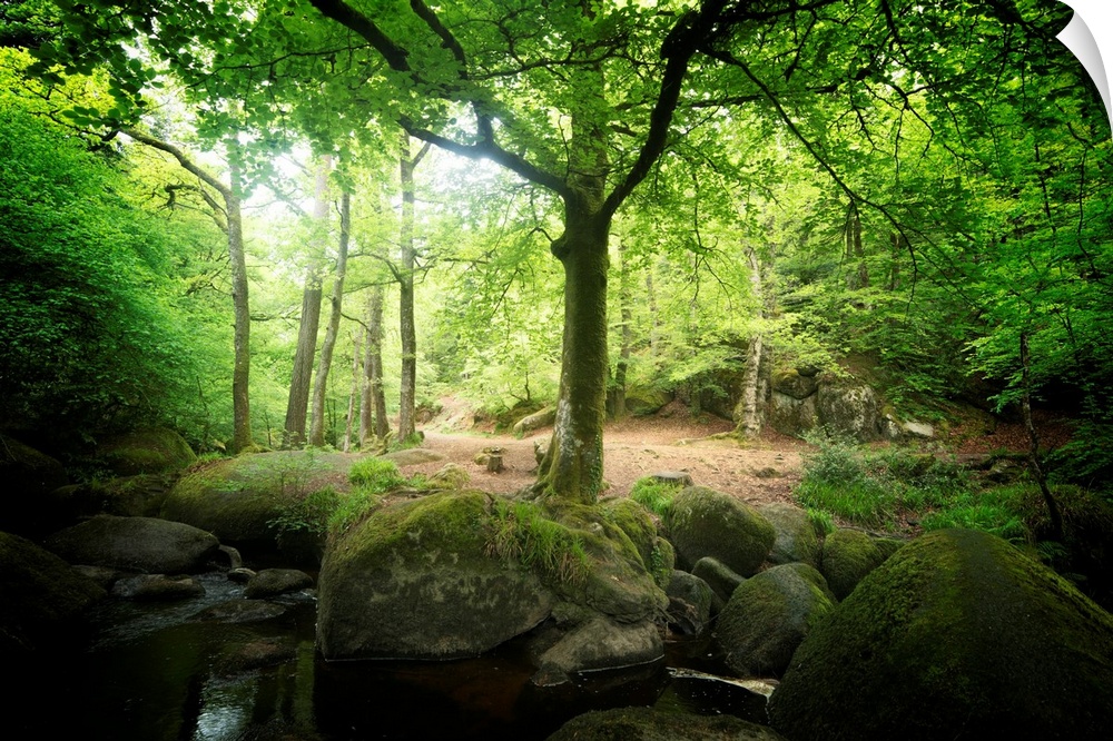 <p>Huelgoat forest in Brittany with green trees around the silver river in the place called the chaos</p>