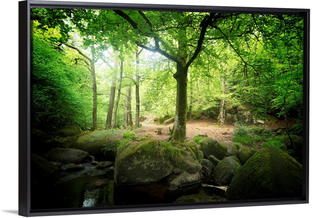 <p>Huelgoat forest in Brittany with green trees around the silver river in the place called the chaos</p>