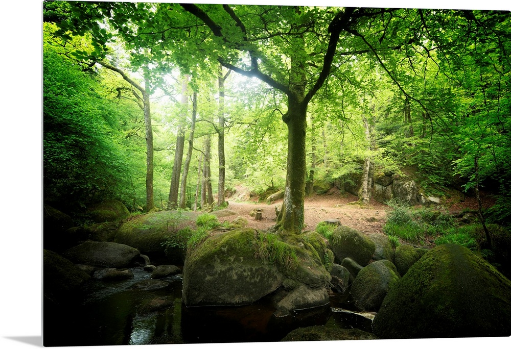 <p>Huelgoat forest in Brittany with green trees around the silver river in the place called the chaos</p>