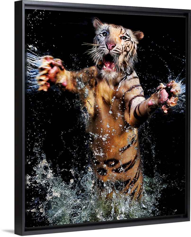<p>A tiger leaping out of the water with its arms outstretched.</p>