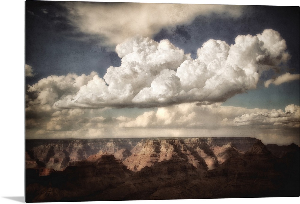 <p>Huge canyon in the background looking across the Grand Canyon in USA with clouds in a blue summer sky with texture layer</p>