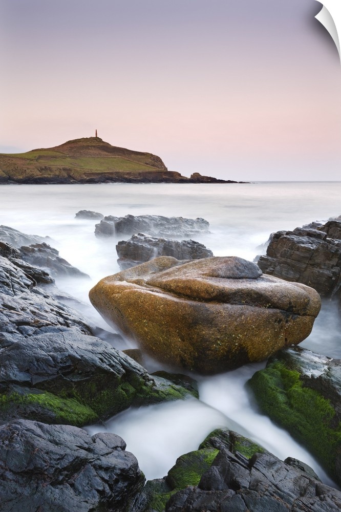 <p>Huge granite boulder lodged on the shores of Porth Ledden at dawn, Cornwall, England. Spring, April, 2010.</p>