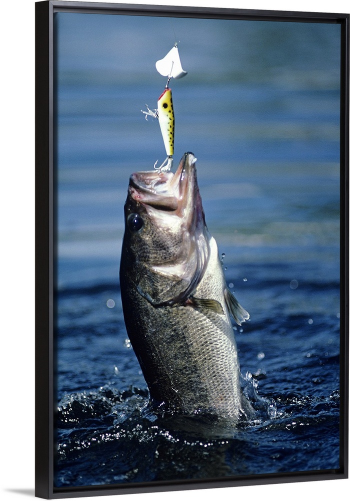 <p>A decorative accent for an angler or fishing enthusiast this vertical nature photograph is a close up of a fresh water fish leaping out of the water after a fishing lure.</p>