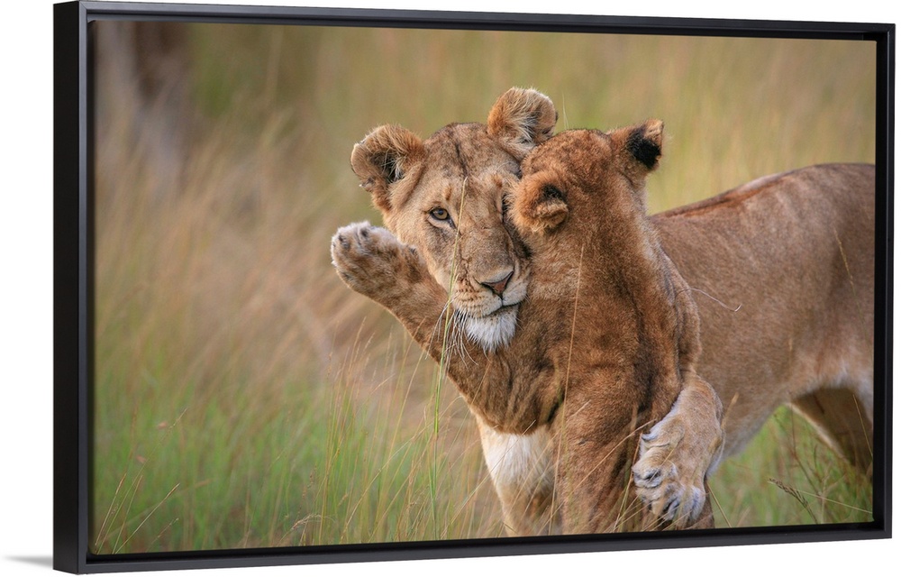 <p>A loving photograph of a lion cub and mother embracing in a playful hug.</p>