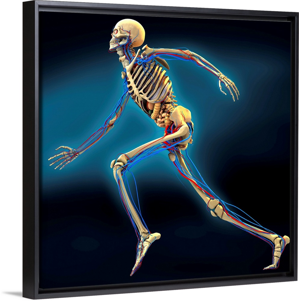 <p>Human anatomy. Computer artwork of a human skeleton running. The arteries (red lines), veins (blue lines), nervous system (white lines) and the male reproductive system are shown. The small (inner) and large (outer) intestines are seen in the abdomen. Above these are the stomach (orange), gall bladder (green) and liver (red). Behind the ribs are the lungs. The organs are deformed by the movement of the skeleton. In front of the neck is the thyroid gland.</p>