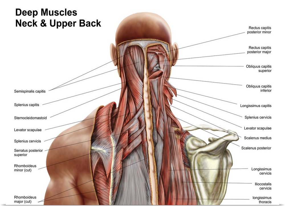 <p>Human anatomy showing deep muscles in the neck and upper back.</p>