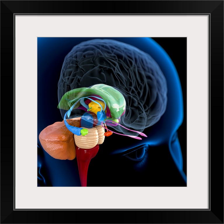 <p>Human brain anatomy. Computer artwork of a person's head showing the brain with the right hemisphere removed. The following regions can be seen: medulla oblongata (brown, bottom left), cerebellum (beige, lower left), pons (light beige, lower centre) hippocampus (blue, centre left), midbrain (purple, centre), thalamus (yellow, centre), corpus callosum (green, upper centre), hypothalamus (blue, centre), optic nerves (pink, centre right), and the pituitary gland (red, centre).</p>