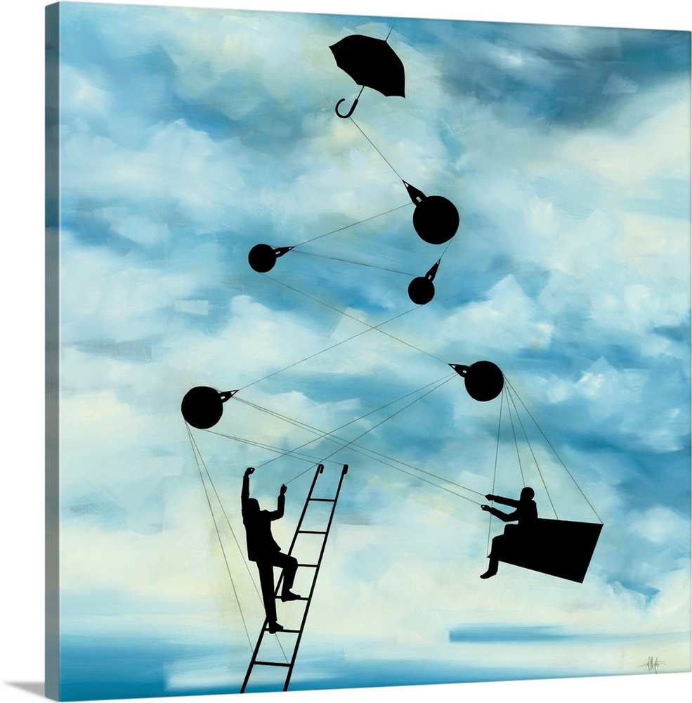 <p>A surreal artwork featuring silhouetted figures climbing a ladder and sitting on a platform, connected by ropes and pulleys to a floating umbrella against a cloudy blue sky, symbolizing effort and interconnectedness.</p>