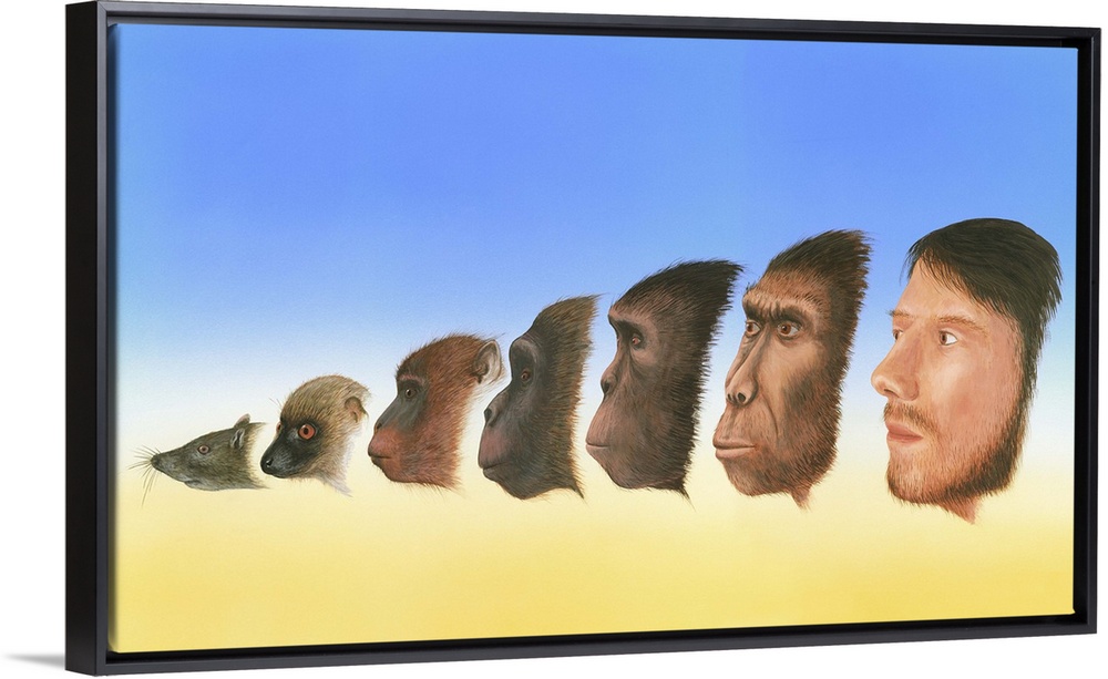 <p>Human evolution. Artwork showing a snapshot of the evolution of humans from earlier forms of life. At far left is the shrew-like mammal, Purgatorius (65 million years ago, mya), that is thought to have evolved into a lemur-like animal (second from left, 45 mya). Following this is a succession of four pre-human primates: Aegyptopithecus (35 mya), Proconsul (20 mya), Australopithecus afarensis (4 mya), and Homo erectus (1 mya). Finally, modern humans, Homo sapiens (far right), appeared around 400 thousand years ago.</p>