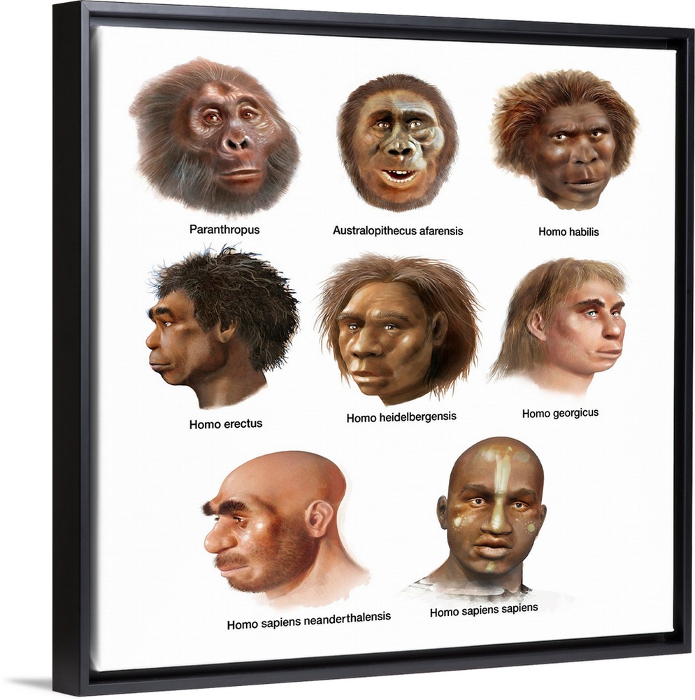 <p>Human evolution. Artwork of eight different species from the human evolutionary tree, all now extinct except modern humans (Homo sapiens sapiens, lower right). The others are: Paranthropus (upper left, around 2.7 million years ago); Australopithecus afarensis (upper centre, 3.9 to 2.9 million years ago); Homo habilis (upper right, 2.3 to 1.4 million years ago); Homo erectus (centre left, 1.9 million to 150,000 years ago); Homo heidelbergensis (centre, 600,000 to 200,000 years ago); Homo georgicus (centre right, around 1.8 million years ago); and Homo sapiens neanderthalensis (lower left, around 600,000 to 45,000 years ago). Modern humans evolved around 200,000 years ago.</p>