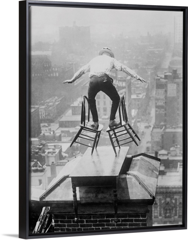 <p>Human Fly' John 'Jammie' Reynolds balances precariously on two tilted chairs. The dare-devil is on the roof edge of a tall Manhattan building, perched on a table placed over a chimney. Ca. 1915-1920.</p>