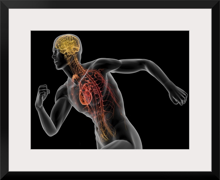 <p>Human male anatomy. Computer artwork highlighting the brain and heart of a healthy male in a running pose.</p>