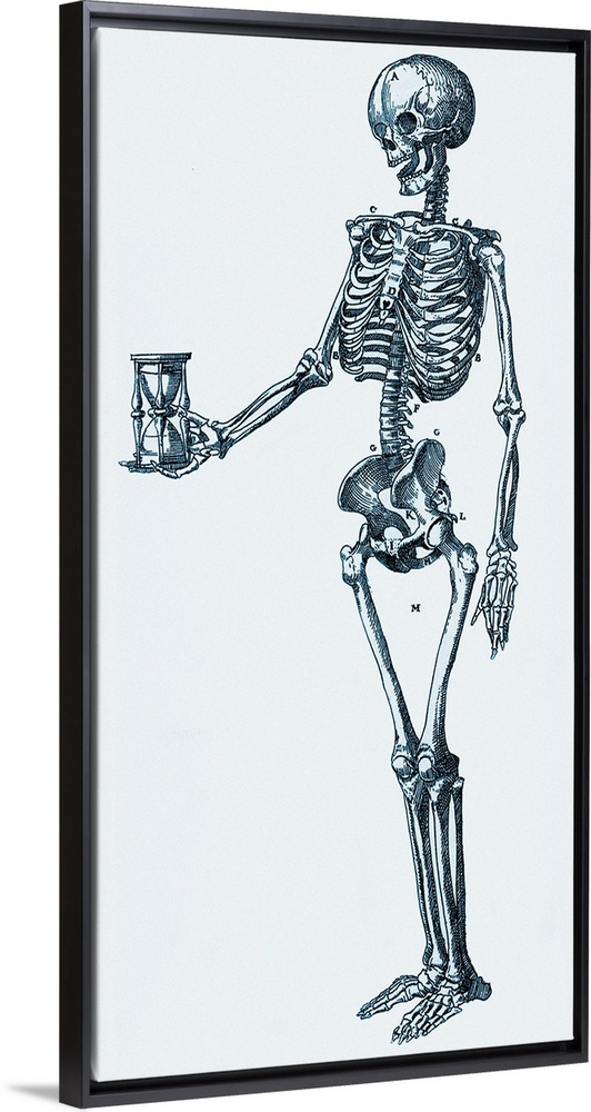 <p>Human skeleton. Historical artwork of a human skeleton holding an hourglass. The 206 bones of the skeleton provide protection and support to the body. The ribs of the chest (upper right) enclose the heart and lungs. The pelvis protects (centre right) the lower abdominal organs. The flexible backbone runs from the skull to the pelvis and protects the spinal cord. The bones of the arms and legs articulate to provide locomotion. Hourglasses are used to measure time. It may symbolise ageing or death. This artwork is by Felix Platter and was published in 1583.</p>