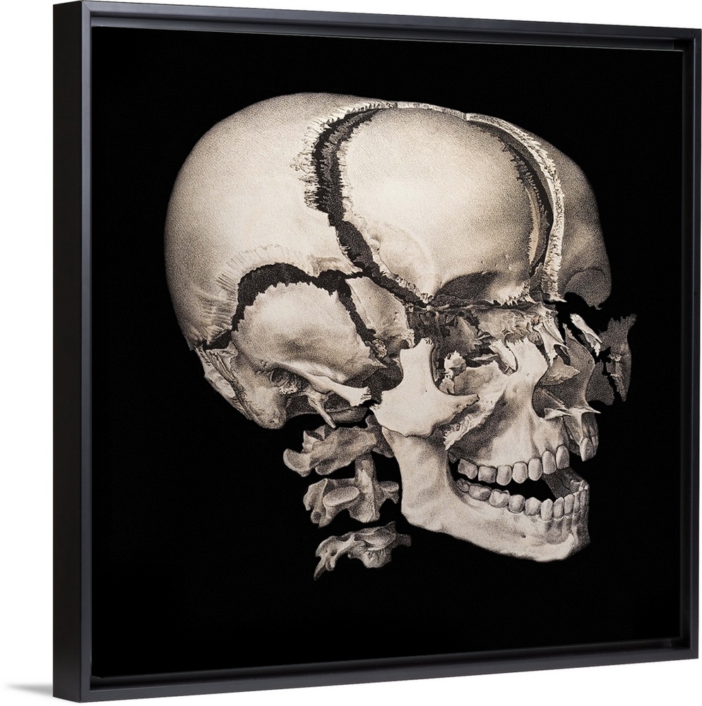 <p>Human skull. Historical anatomical artwork of the bones of the skull of a human male. This exploded view shows the bones separated along the joints (sutures) that are fused in an intact skull. The first three vertebrae in the neck are also shown, and are separated to show the nature of the joints. The upper and lower jaw bones (lower right) contain 32 permanent teeth. Artwork from the 19th-century book Atlas of Anatomy, by Bourgery and Jacob. This book, which took over 20 years to complete, was published in France in 8 volumes from 1831 to 1854. It contained 726 colour plates covering both anatomy and surgical techniques.</p>