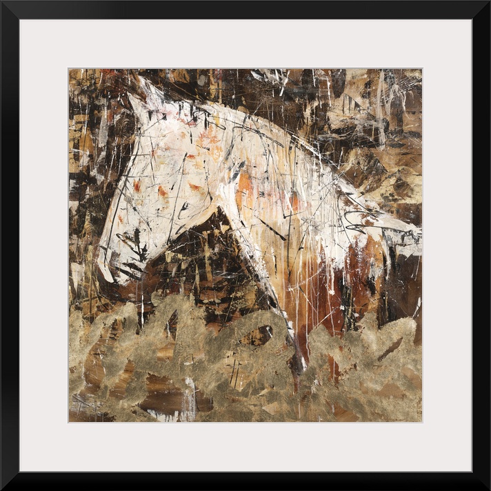 <p>Square abstract painting of a horse silhouette in shades of brown, gold, orange, and white.</p>