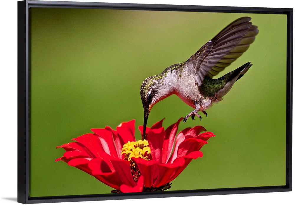 <p>Hummingbird feeding at red and yellow Zinnia.</p>