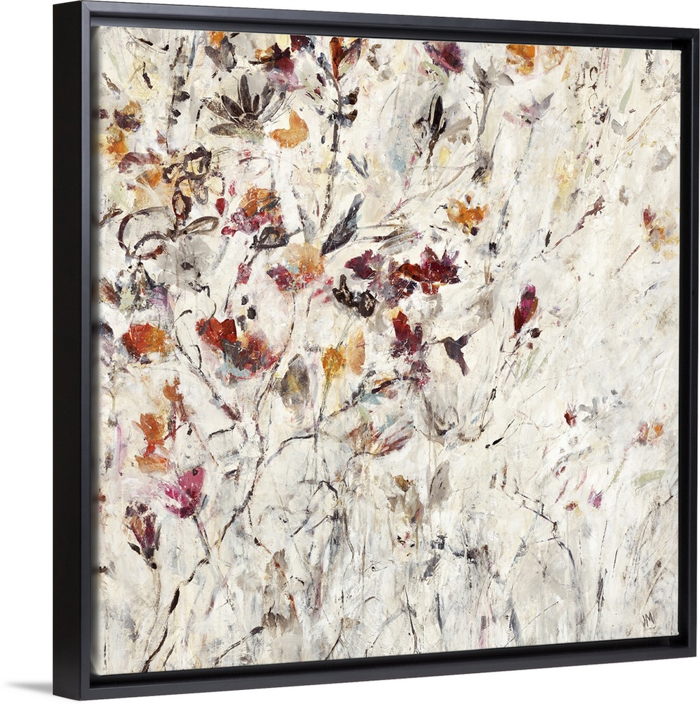 <p>Square painting with orange, pink, and red abstract flowers on a neutral colored background.</p>