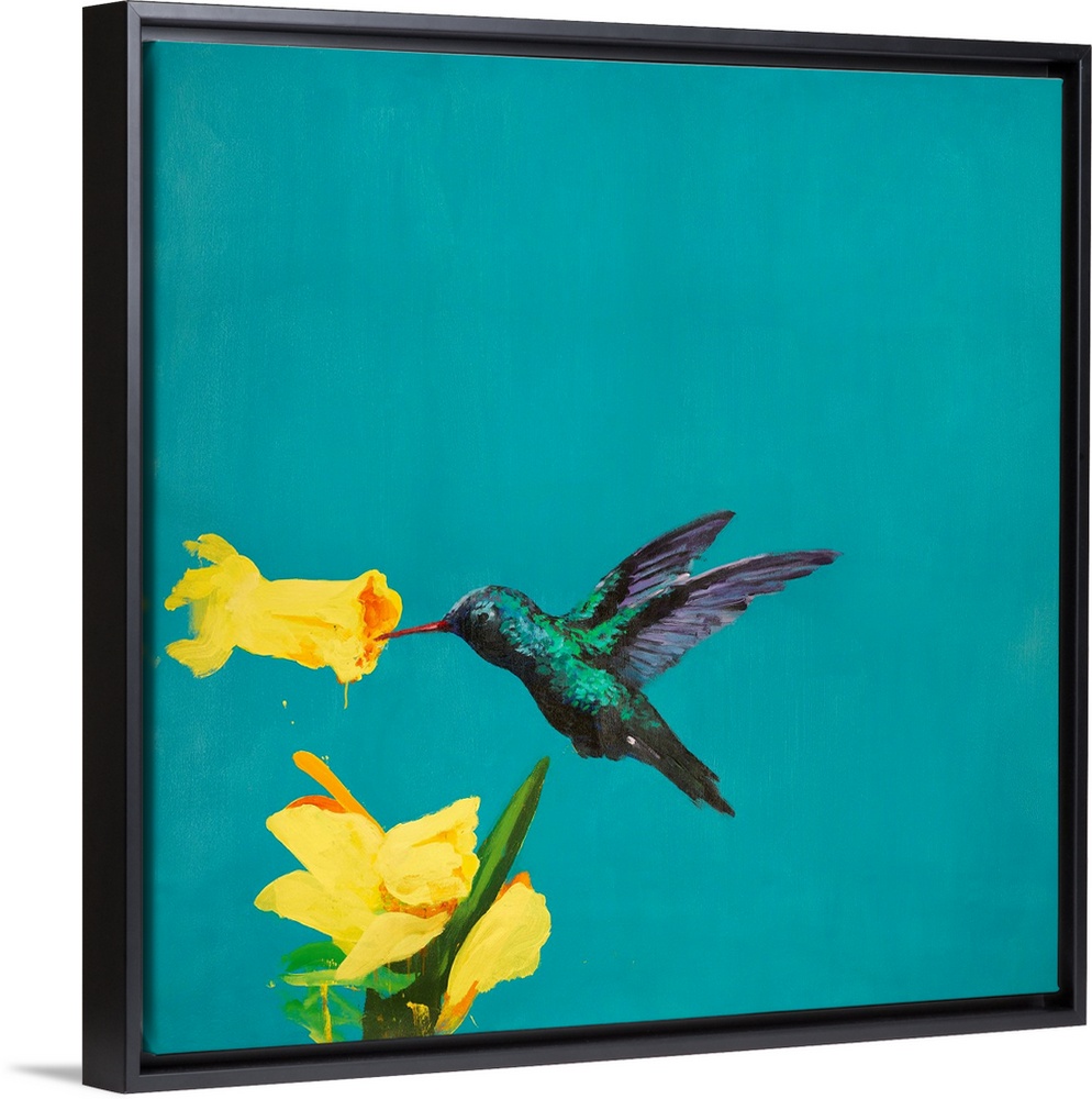 <p>Contemporary artwork of a hummingbird gathering nectar from a tropical flower.</p>