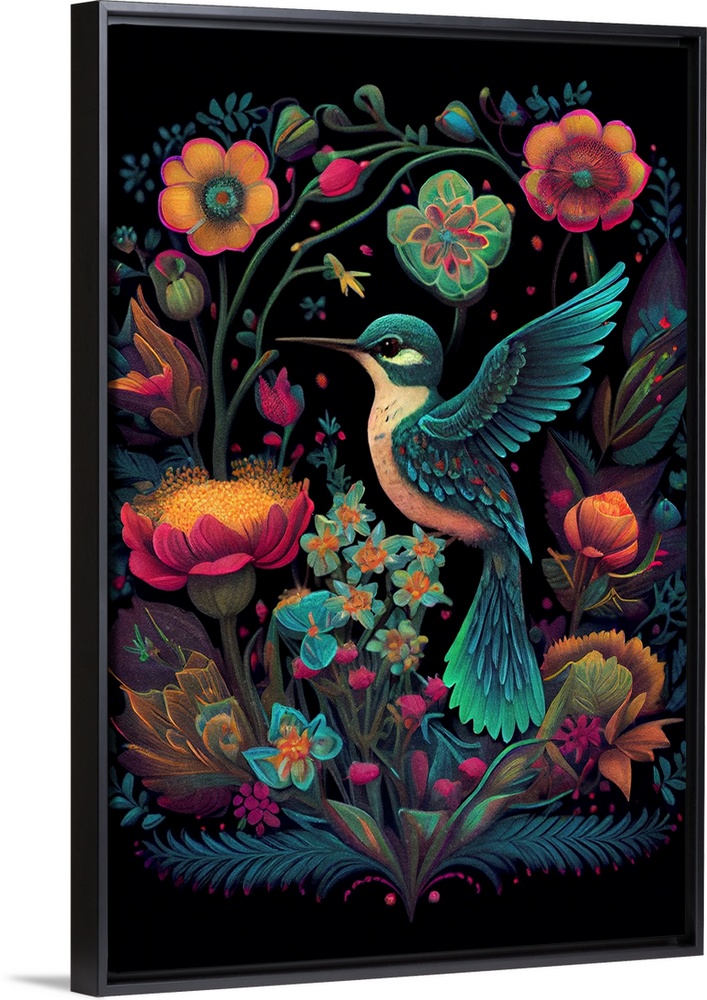 <p>This image by JK Stewart for Duirwaigh Studios is of a hummingbird surrounded by an assortment of florals.</p>