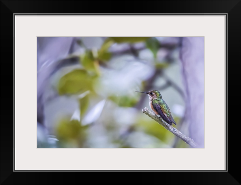 <p>Hummingbird with colourful plumage perched on a branch; Atlin, British Columbia, Canada</p>