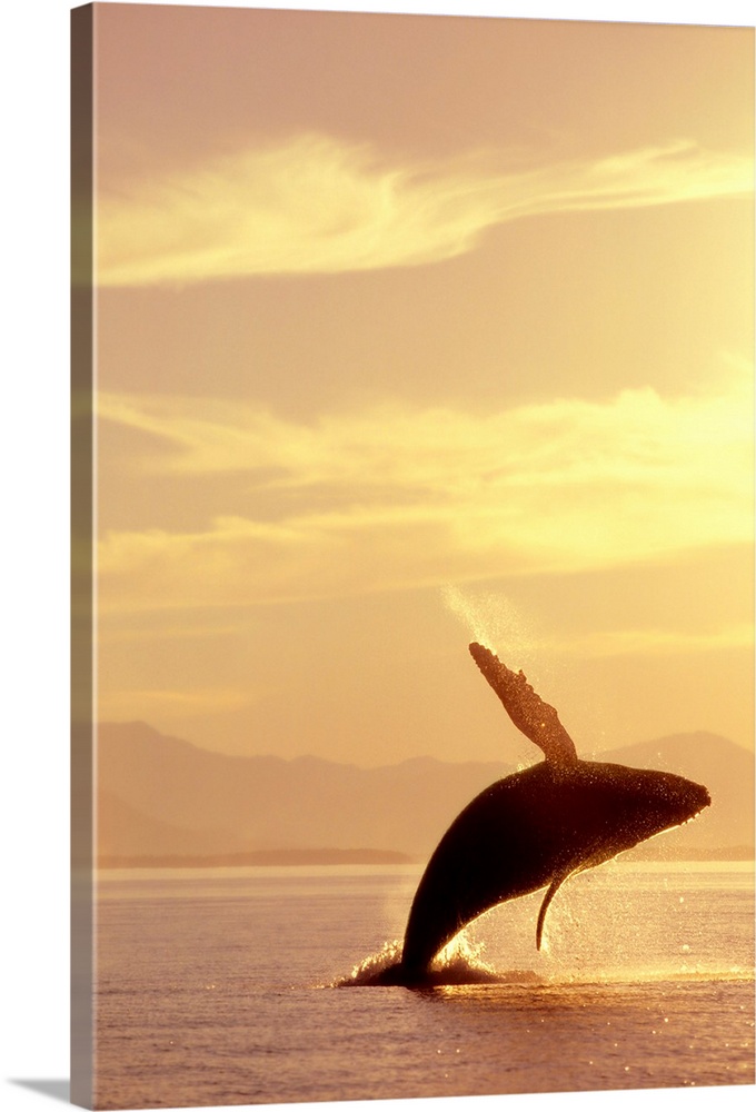 <p>Wildlife photograph of a humpback whale breaching in Inside Passage in Alaska at sunset during the summer.</p>