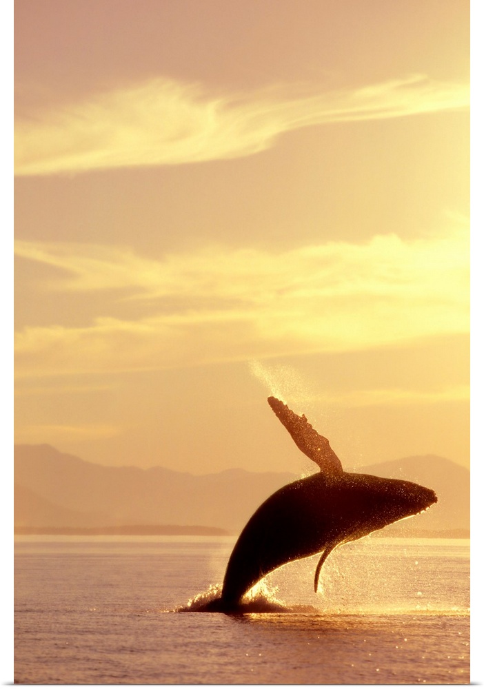 <p>Wildlife photograph of a humpback whale breaching in Inside Passage in Alaska at sunset during the summer.</p>