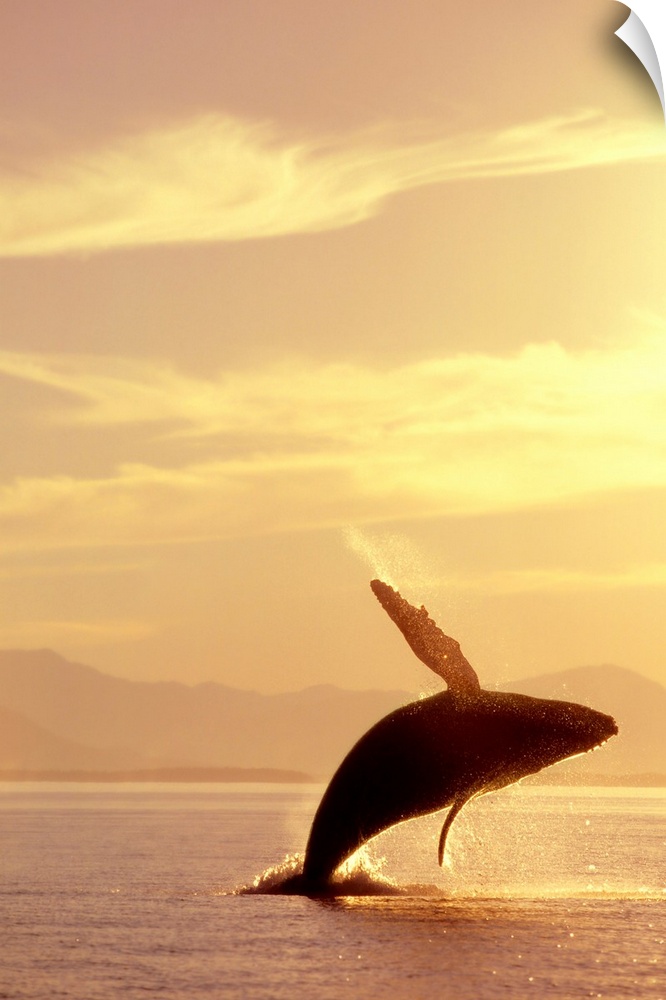 <p>Wildlife photograph of a humpback whale breaching in Inside Passage in Alaska at sunset during the summer.</p>