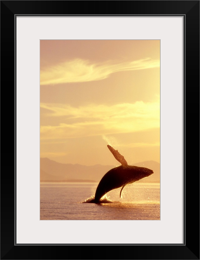 <p>Wildlife photograph of a humpback whale breaching in Inside Passage in Alaska at sunset during the summer.</p>