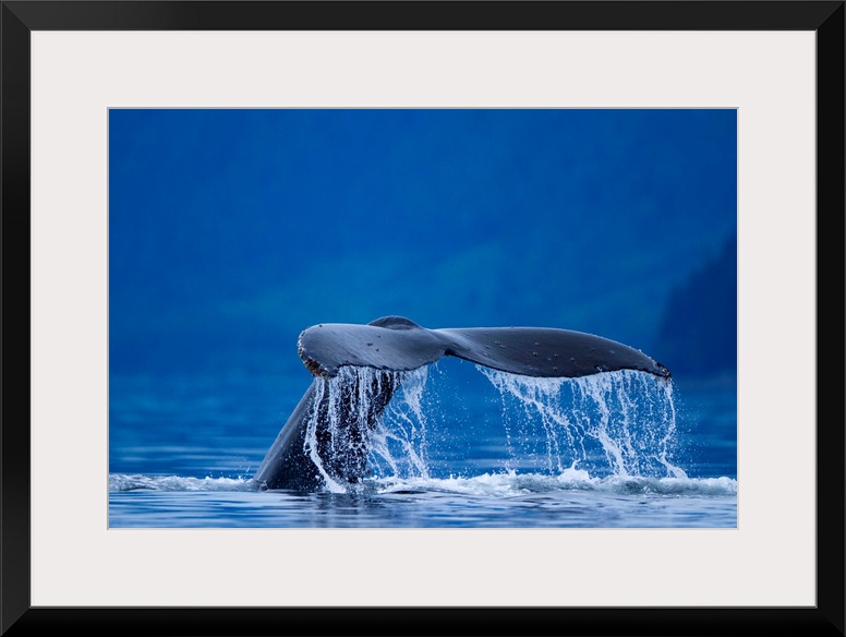 <p>USA, Alaska, Tongass National Forest, Water pours from tail of Humpback Whale (Megaptera novaengliae) diving in Frederick Sound on summer evening</p>