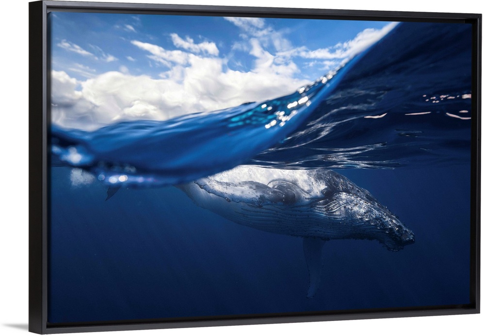 <p>A dynamic cross section shot of a humpback whale close to the surface of the ocean.</p>