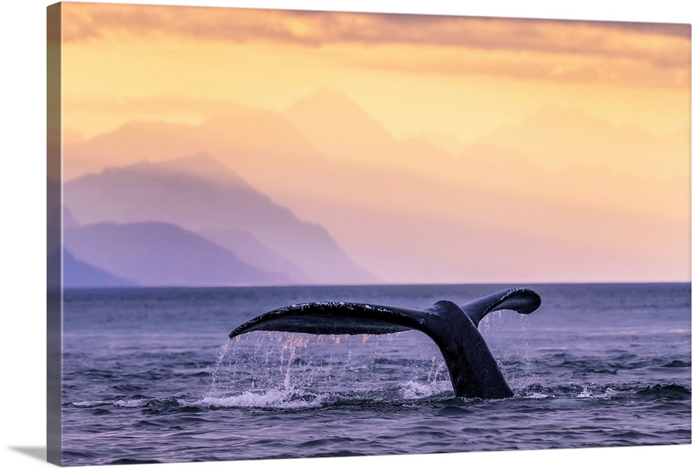 <p>Humpback Whale (Megaptera novaeangliae) at sunset, Lynn Canal, Chilkat Mountains, Inside Passage, near Juneau; Alaska, United States of America</p>