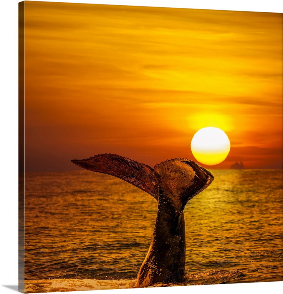 <p>A humpback whale (Megaptera novaeangliae) lifts it's tail in the air at sunset; Hawaii, United States of America</p>