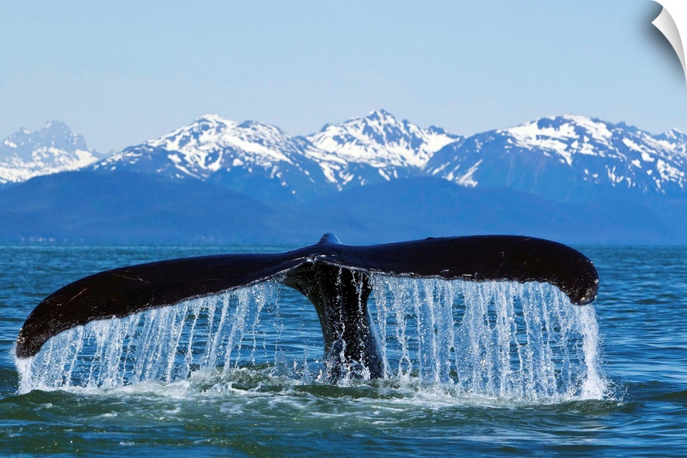 <p>A Humpback Whale lifts its flukes as it returns to the depths in the calm waters of SE Alaska's Inside Passage at sunset, Lynn Canal, snow capped Chilkat Mountains beyond.</p>
