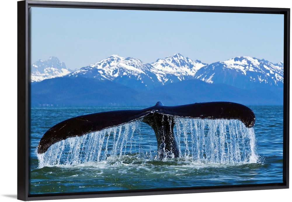 <p>A Humpback Whale lifts its flukes as it returns to the depths in the calm waters of SE Alaska's Inside Passage at sunset, Lynn Canal, snow capped Chilkat Mountains beyond.</p>