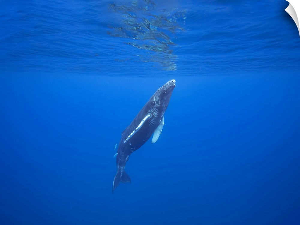 <p>The fish following this surfacing humpback whale (Megaptera novaeangliae) are known as leatherback (Scomberoides lysan) or queenfish. In Hawaii they are also call Lai and are frequently seen following humpback whales to feed on the skin they slough off; Hawaii, United States of America</p>