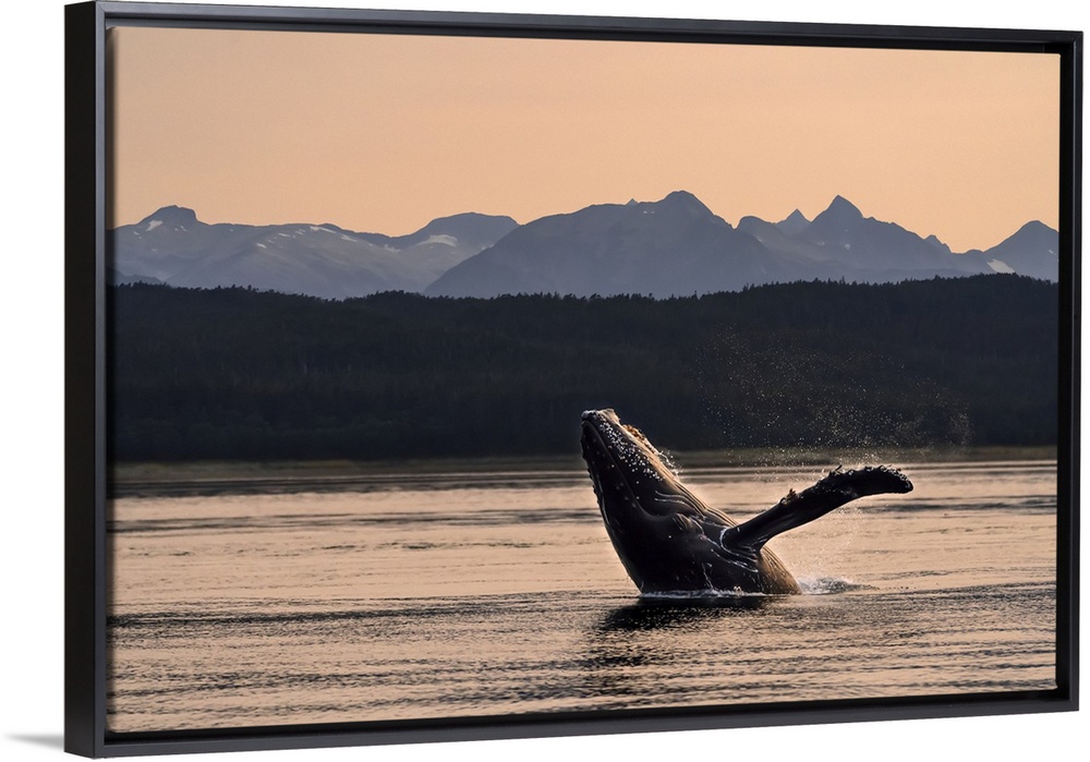 <p>Humpback whale (Megaptera novaeangliae) breaches at sunset, Lynn Canal, Inside Passage, with Chilkat Mountains in the background; Alaska, United States of America</p>