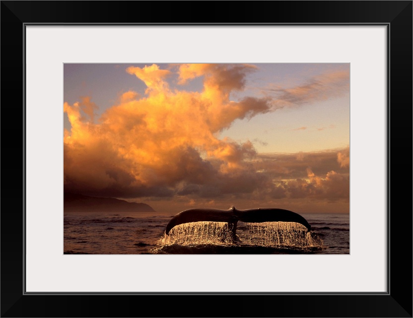 <p>Landscape photograph on a big canvas of a humpback whale tail, dripping after breaking the surface of the water, as the sun sets in a cloudy sky in Southeast Alaska.</p>