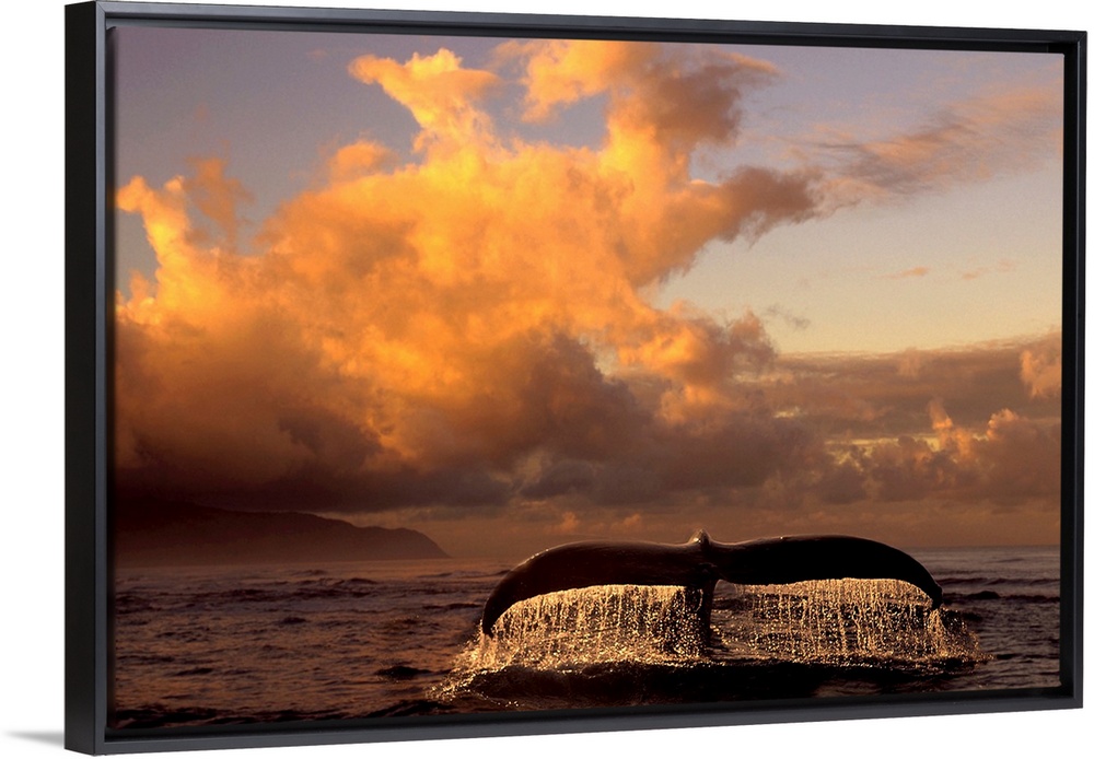 <p>Landscape photograph on a big canvas of a humpback whale tail, dripping after breaking the surface of the water, as the sun sets in a cloudy sky in Southeast Alaska.</p>