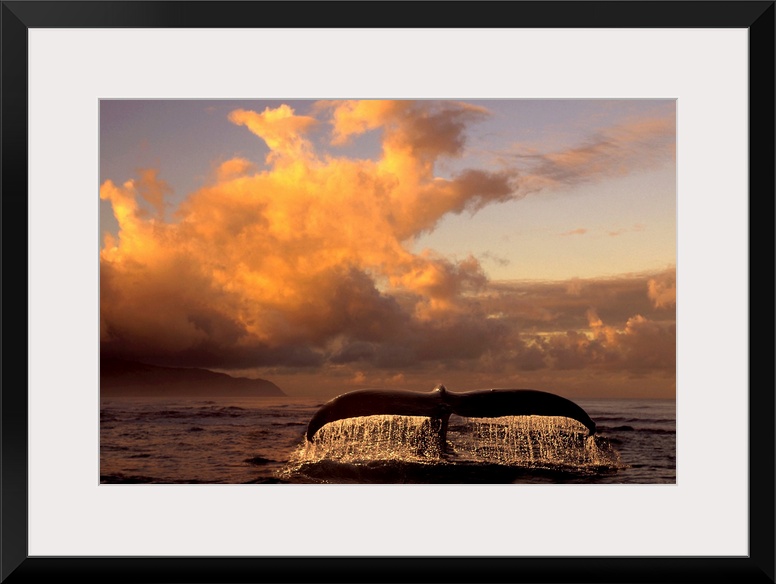 <p>Landscape photograph on a big canvas of a humpback whale tail, dripping after breaking the surface of the water, as the sun sets in a cloudy sky in Southeast Alaska.</p>