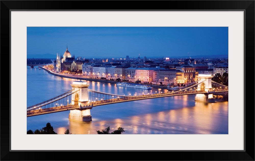 <p>Hungary, Budapest, Budapest, Chain Bridge, Danube,Donau, Danube, Travel Destination, Parliament on the Pest Embankment iIlluminated at dusk</p>